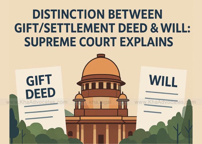 Read MoreThe legal distinction between a Gift/Settlement Deed and a Will plays a vital role in property transfer and succession planning under Indian law. The Supreme Court of India, in a series of landmark judgments, has clarified the core legal principles that separate these two instruments. Understanding the difference is crucial to avoid future disputes, especially concerning immovable property.Definitions Under Indian LawGift Deed / Settlement DeedA Gift Deed, governed by Section 122 of the Transfer of Property Act, 1882, is a voluntary transfer of property by one person (donor) to another (donee) without consideration, accepted by the donee during the lifetime of the donor. A Settlement Deed is a broader document often used to distribute property among family members for future stability.Key Features:Immediate and irrevocable transferRequires registration under Section 17 of the Registration Act, 1908Stamp duty applicable as per state lawEffective during the lifetime of the settlor/donorWillA Will, as per Section 2(h) of the Indian Succession Act, 1925, is a legal declaration of the testator’s intention with respect to their property, which comes into effect only after their death.Key Features:Revocable until the testator’s deathNo stamp duty requiredRegistration is optional but advisableTakes effect posthumouslySupreme Court’s Interpretation: Key Judgments🔹 Thulasamma v. Sesha Reddy (1977)The Court held that the intention of the parties is paramount. Even if a document is titled a “Settlement,” if it confers rights only after the death of the settlor, it operates as a Will.🔹 Radha Ammal v. Camillus AIR 2006 SC 1781The Supreme Court clarified that nomenclature is not conclusive. A document labeled as a settlement deed may actually be a Will if the transfer is postponed until the death of the person executing the deed.🔹 K.K. Mohammad Ali v. State of Kerala (2010) 1 SCC 417It was emphasized that the timing of when the rights vest in the beneficiary is critical. If vesting is immediate, it’s a gift/settlement. If it’s deferred till death, it’s a will.Key Legal Differences SummarizedAspectGift/Settlement DeedWillTakes EffectImmediatelyAfter DeathRevocabilityIrrevocableRevocableStamp DutyMandatoryNot RequiredRegistrationMandatoryOptionalConsiderationNot RequiredNot ApplicableVesting of RightsDuring Settlor’s LifetimeUpon Testator’s DeathWhy This Distinction MattersSuccession Disputes: Incorrect drafting may lead to family feuds and litigation.Tax Implications: Stamp duty and tax liability differ drastically.Validity Issues: Unregistered gift deeds may be invalid; unregistered wills may face challenge during probate.Pro Tips by KHA ADVOCATESUse Precise Language: Clearly express intention to avoid misinterpretation.Consult a Property Lawyer: Especially important for NRI clients dealing with Indian assets.Register All Deeds: Avoid ambiguity by registering gifts/settlements.Update Will Regularly: Changes in family or assets must be reflected promptly.ConclusionThe Supreme Court’s consistent stance makes one thing clear: intention and timing of vesting are the defining parameters. While both documents can be used to transfer property, choosing the correct one based on your situation is vital. Legal consultation ensures your assets are protected and your legacy preserved.